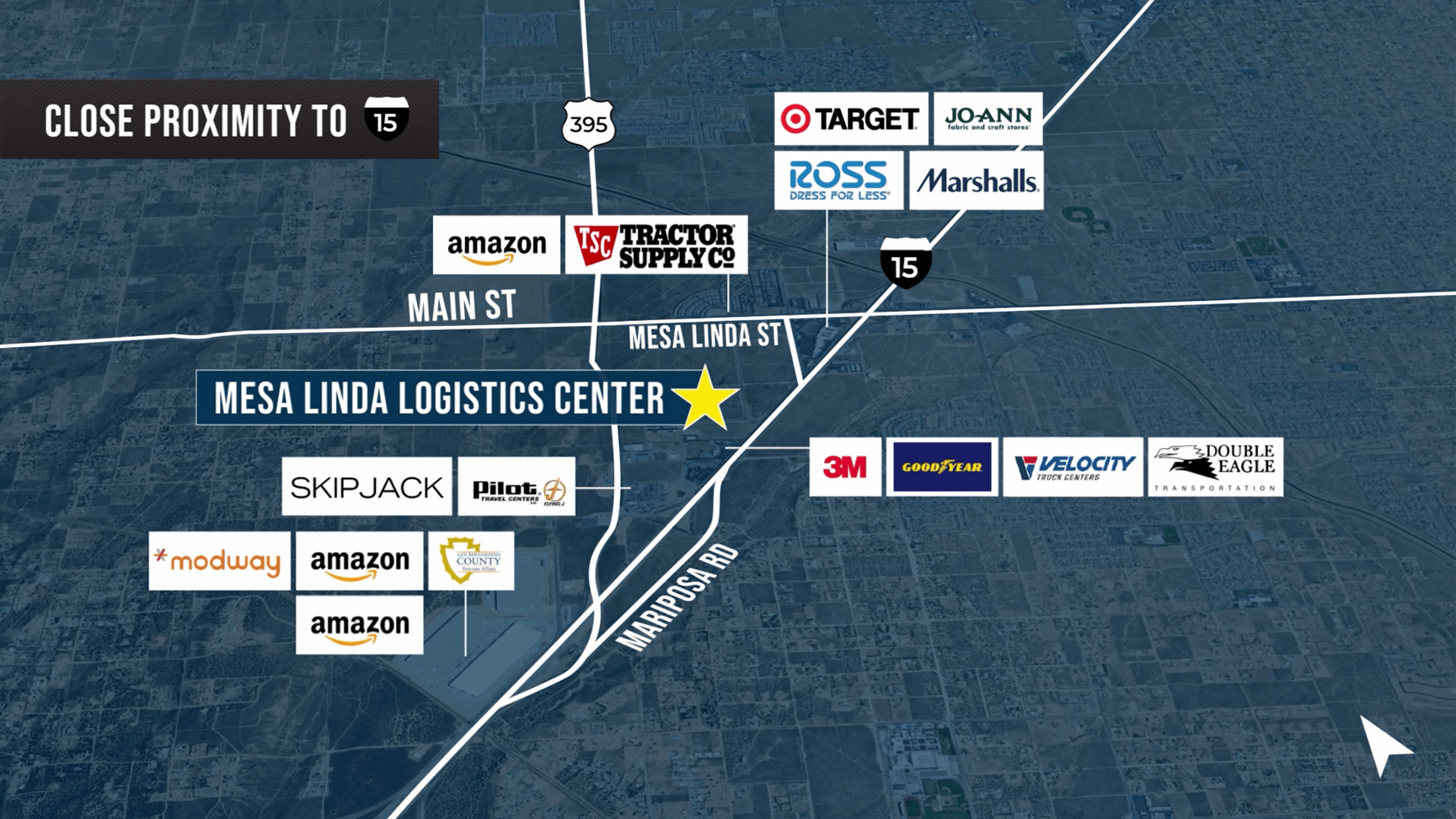 The Mesa Linda Logistics Center is surrounded by a strong mix of national retailers and industrial operators, including 3M, Goodyear, Modway, Skipjack Boats, and Pilot Travel Centers. Nearby neighbors like Velocity Truck Center and West Coast Fleet Services further underscore the area's industrial utility and fleet support. With direct access to I-15 and proximity to major arterials like Highway 395, the site sits within a highly active commercial corridor. This location offers immediate alignment with established supply chain and logistics infrastructure.