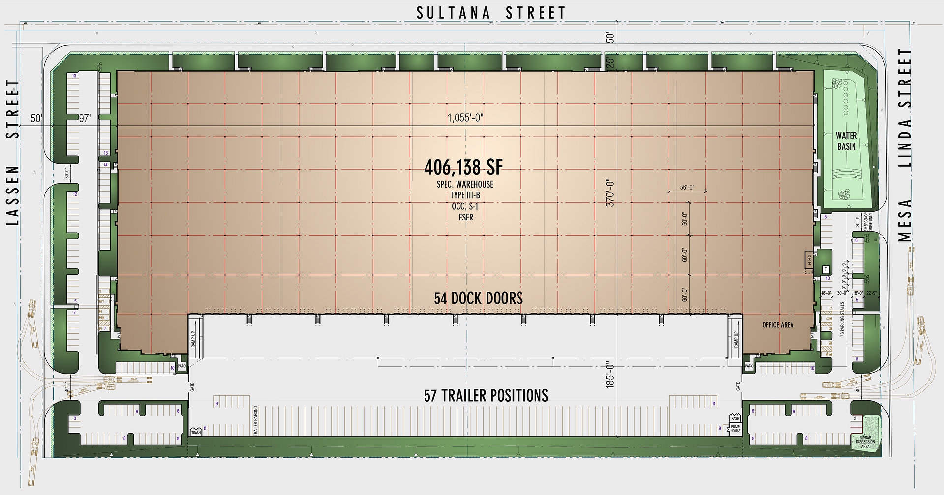 The Mesa Linda Logistics Center offers a thoughtfully designed site plan optimized for large-scale distribution and logistics. The ±17.54-acre site includes 54 dock-high doors, 2 ground-level doors, and a secured 185-foot concrete truck court for seamless freight movement. With 219 auto parking stalls and 57 trailer stalls, the layout ensures ample vehicle access and maneuverability. The building orientation and yard configuration are engineered for efficiency and scalability.