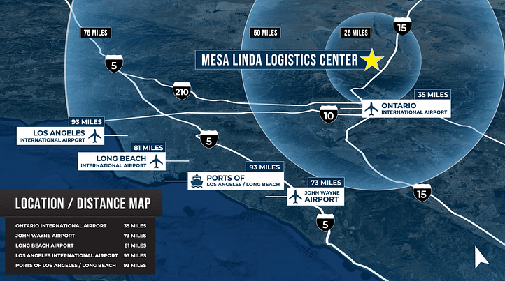 Strategically located in Hesperia, the Mesa Linda Logistics Center offers direct access to the I-15 Freeway and efficient connectivity to major Southern California markets. The property is just 35 miles from Ontario International Airport and within 100 miles of four major airports, including LAX and John Wayne.